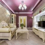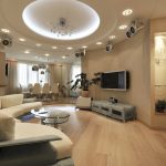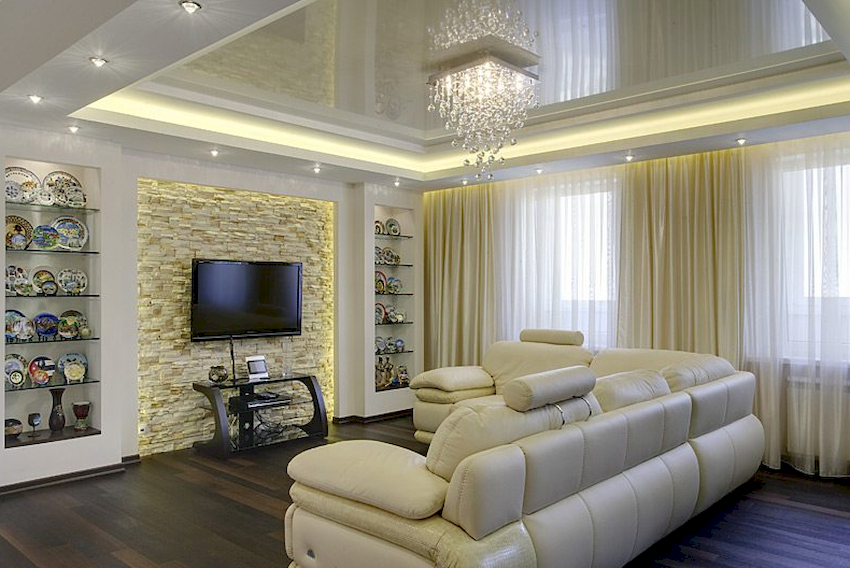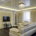 Nasihat berguna! Untuk ruang tamu dengan siling regangan, lebih baik memilih candelier dengan sebilangan besar mentol lemah, daripada produk dengan sedikit elemen pencahayaan yang kuat.