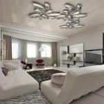 Anda tidak boleh membeli candelier jenis overhead untuk siling regangan di ruang tamu dalam bentuk piring dengan badan logam, dan pilihan untuk candelier dengan lengan yang diarahkan ke atas juga tidak termasuk. Ini akan menyebabkan bulatan hitam terbentuk di siling. Di sini, keutamaan diberikan kepada struktur di mana warna diarahkan ke bawah atau ke sisi.