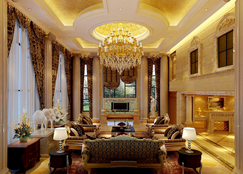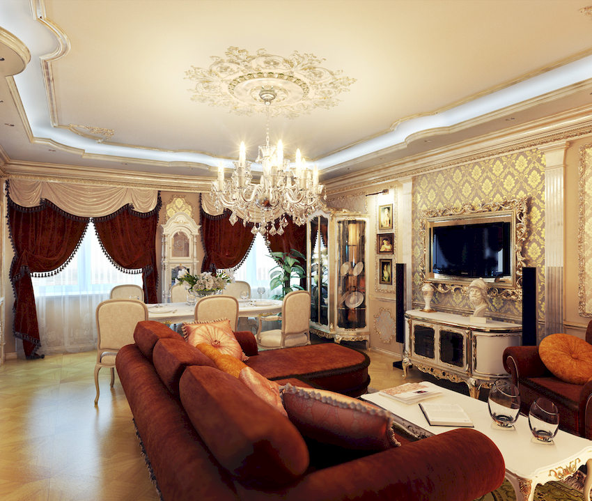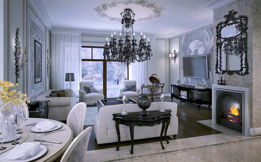 Gaya Barok lebih mengutamakan kehebatan dan kerabat diraja dalam semua perincian dalaman. Di ruangan seperti itu, adalah wajar untuk kelihatan seperti candelier kristal yang indah di ruang tamu dengan bingkai besi tempa, dilengkapi dengan banyak loket hiasan yang menerangi ruangan dengan cemerlang. Sebilangan besar garis bunga dan renda digalakkan.