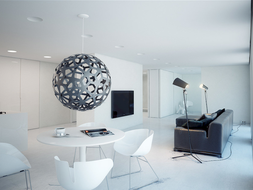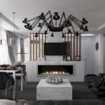 Candelier siling secara organik akan sesuai dengan gaya loteng ke ruang reka bentuk yang tidak biasa, yang menyerupai labah-labah, dengan loket yang diperbuat daripada wayar dan lampu di hujungnya. Wayar mempunyai struktur yang fleksibel yang membolehkan anda menukar lokasi mentol. Produk dalam warna hitam akan memberi kesan terbaik. Untuk minimalisme, candelier ekspresif dengan bentuk geometri yang ketat, dibuat dalam naungan monokrom, sesuai. Di sini, produk laconic tanpa unsur hiasan dialu-alukan.