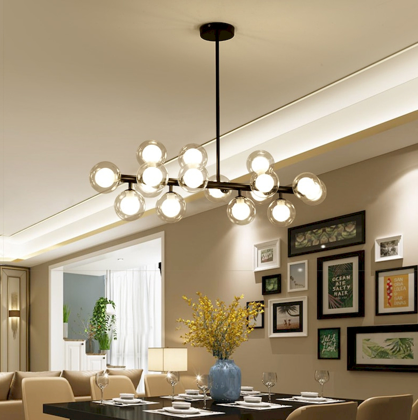 Produk ini memiliki bentuk warna yang berbeza, dapat ditambah dengan lampu sorot atau pelindung lampu, seperti yang ditunjukkan dalam foto lampu gantung moden di ruang tamu. Candelier gantung dipasang dengan tali atau rantai.