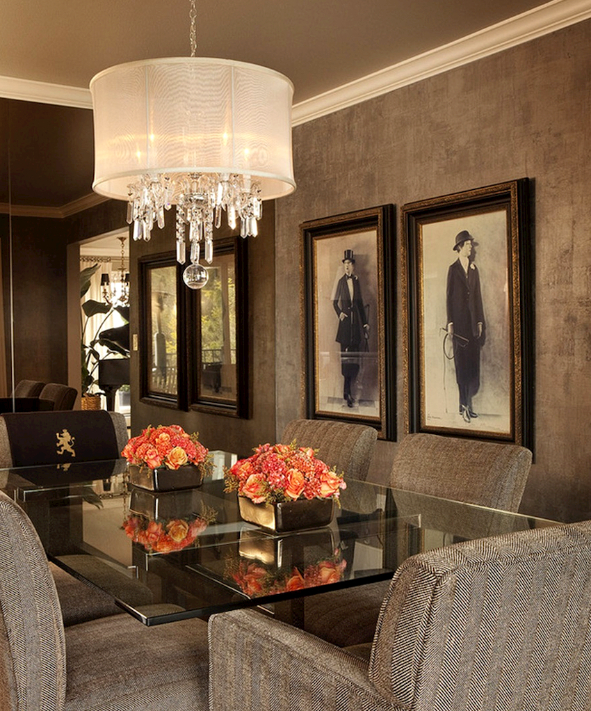 Lekapan lampu sangat popular sekarang, di mana candelier kristal klasik digabungkan dengan kap lampu tekstil. Unsur terakhir terutama terbuat dari bahan lut yang memancarkan cahaya dengan baik, sambil meredupkannya, seperti yang ditunjukkan pada foto candelier dewan gaya moden.