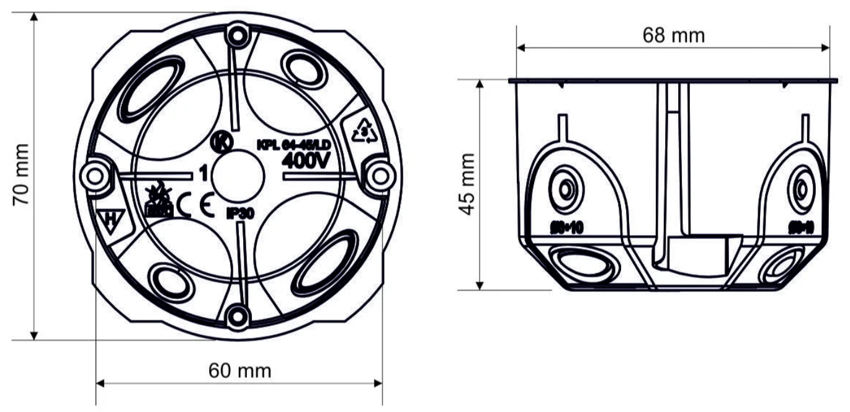 Kacamata dari pengeluar domestik Hegel juga mempunyai kedalaman 60 mm dengan diameter standard 68. Kotak ini direka untuk memasang dimmer dengan reka bentuk dan suis yang kompleks.