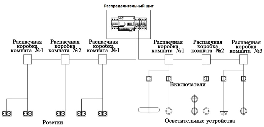 Dalam kes ini, setiap bilik dilengkapi dengan kotak persimpangan. Sudah menjadi kebiasaan meletakkannya di pintu masuk bilik (di atas suis). Melalui penggunaan kotak seperti itu semua peralatan elektrik di dalam bilik dihidupkan.
