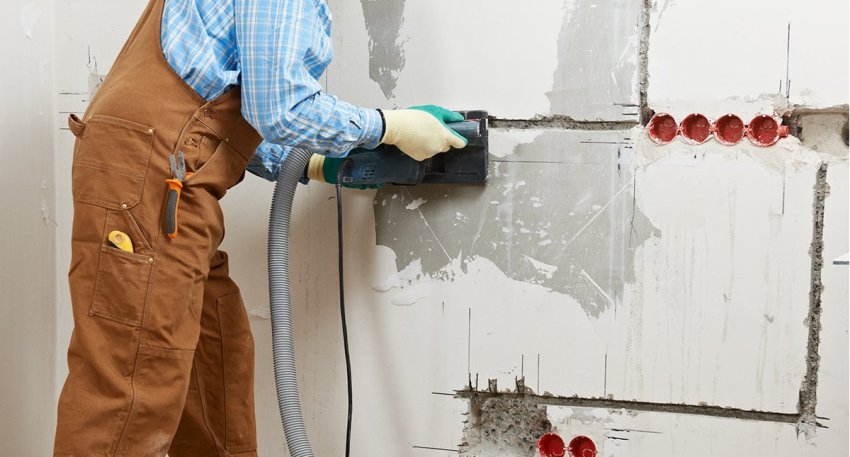 Dengan bantuan penggiling, anda perlu menggerudi ceruk kecil di dinding yang akan digunakan untuk soket