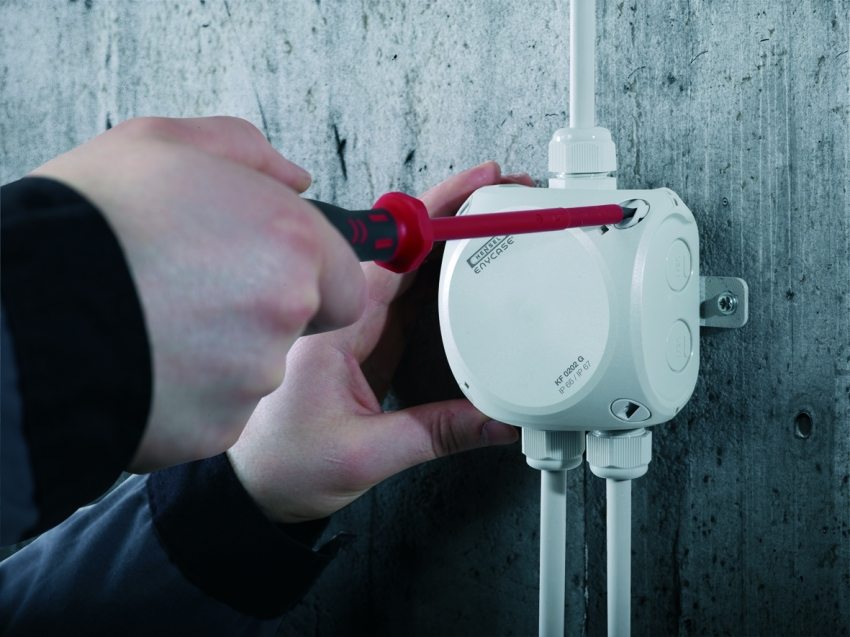 Setelah mengetahui cara-cara di mana wayar dapat diikat bersama, kami akan mempertimbangkan cara memasang sistem itu sendiri menggunakan contoh kotak persimpangan IP55 untuk pemasangan luar 100x100x50 mm.