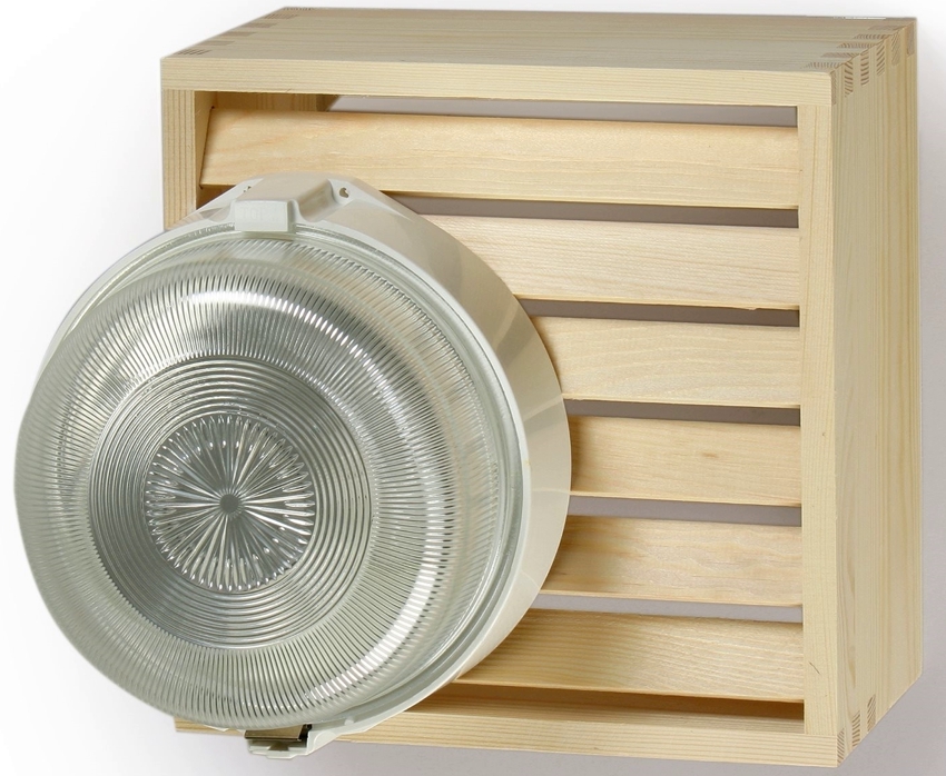Lampu kayu di tempat mandi adalah lampu dengan teduhan kaca tahan panas, yang ditutup dengan naungan kayu. Beberapa pengeluar menawarkan perlindungan hiasan ini lengkap dengan peranti utama, dalam kes lain ia boleh dibeli secara berasingan atau dibuat dengan tangan.