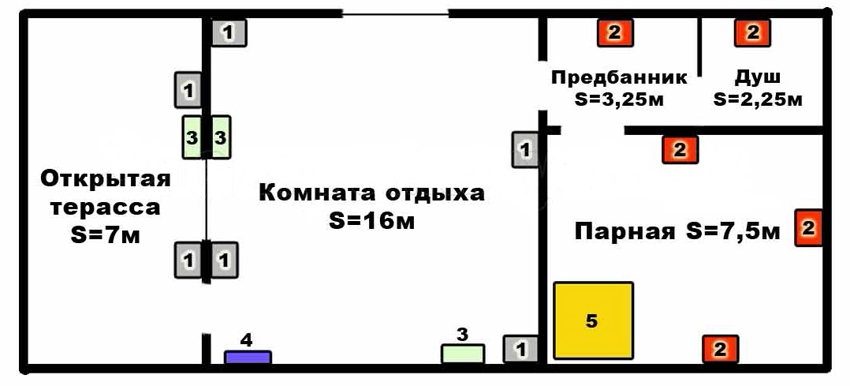 Contoh gambarajah pendawaian untuk mandi: 1 - lampu LED, 2 - lampu kalis haba dan kelembapan khas, 3 - soket, 4 - panel elektrik, 5 - ketuhar