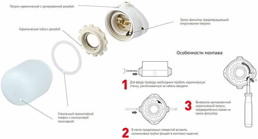 Walaupun terdapat ketahanan haba yang dinyatakan, tidak digalakkan memasang luminer seramik secara langsung di dasar siling. Pemasangan boleh dilakukan di dinding di bahagian atas bilik.