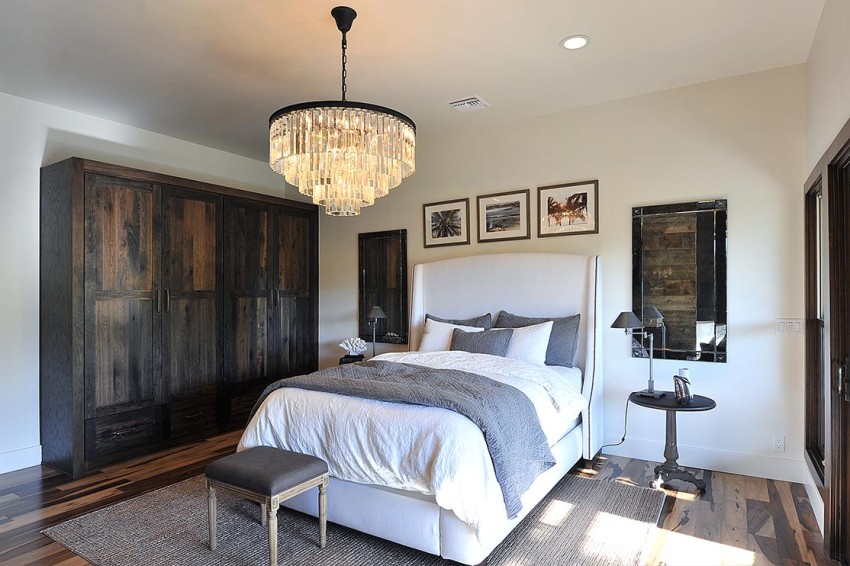 Dalam kes ini, candelier harus digabungkan tidak hanya dengan reka bentuk, skema warna dan gaya dalaman, tetapi juga menyokong reka bentuk peranti lain di dalam ruangan. Selalunya di bilik tidur, lampu dipasang di meja sisi katil atau kawasan kerja diatur. Penting untuk mematuhi idea umum agar semua peralatan di dalam bilik kelihatan harmoni.