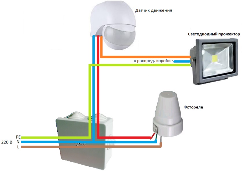 Bagaimana cara menyambungkan sensor gerakan ke lampu sorot jika bukan bahagian struktur utama? Dalam kes ini, teruskan mengikut rajah sambungan berikut: