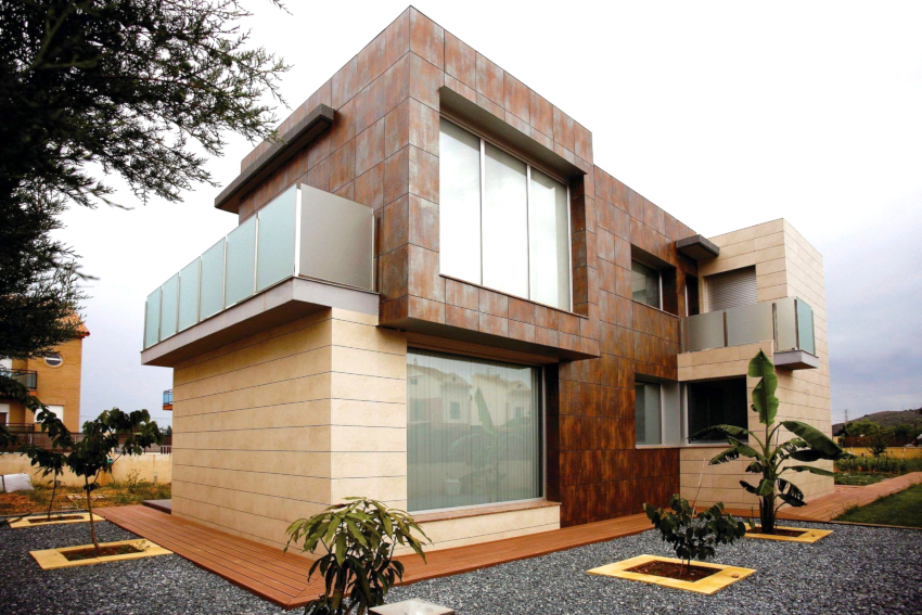 Nasihat berguna! Pemandangan bangunan yang paling dapat dilihat dapat diperoleh dengan menggunakan kaset logam dalam warna tembaga atau tembaga.