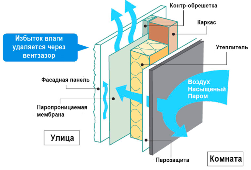 Langkah pertama adalah untuk mengetahui apa itu fasad berventilasi. Ia diwakili oleh struktur multi-lapisan, yang dilekatkan pada bahagian luar dinding bangunan menggunakan profil dan baut. Ruang udara disediakan di antara permukaan struktur dan lapisan bahan penamat untuk memastikan pertukaran udara untuk melindungi dinding dari pengumpulan kelembapan dan mengurangkan pemindahan haba rumah.