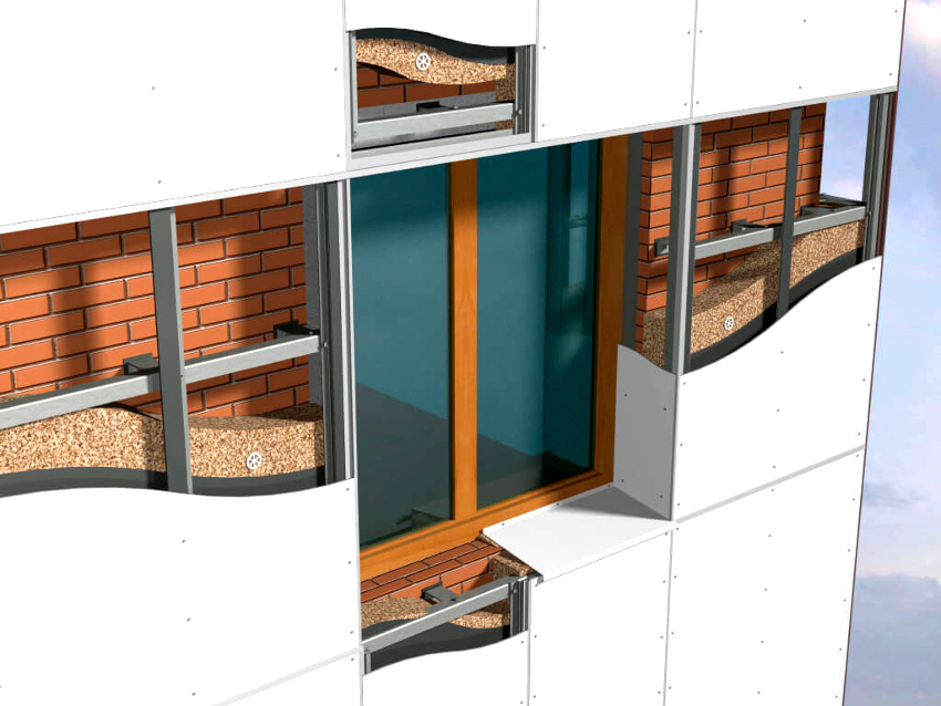 Sistem penebat fasad yang paling popular adalah fasad ventilasi berengsel, yang intinya adalah adanya jurang udara melalui antara fasad dan penebat. Interlayer berventilasi mencegah penembusan kelembapan, dan arus udara di bingkai berengsel menyejukkan dinding dengan baik pada musim panas, bahkan di bawah sinar matahari langsung.