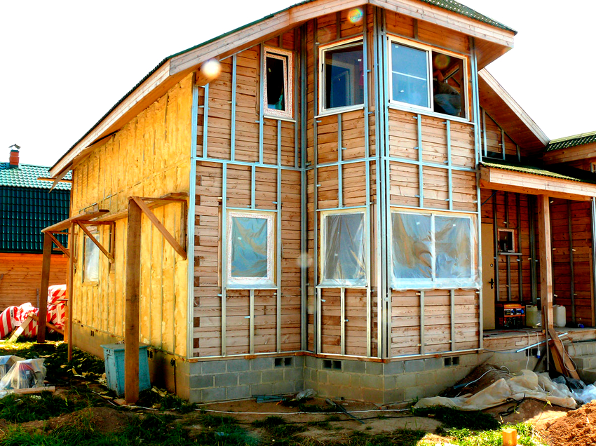 - Berventilasi. Dalam kes ini, tambahan diperlukan untuk membuat interlayer, meletakkannya di antara bahan menghadap luaran dan lapisan penebat. Untuk ini, peti logam atau kayu dipasang. Penebat fasad dengan berpihak hanya dilakukan setelah pemasangan battens.