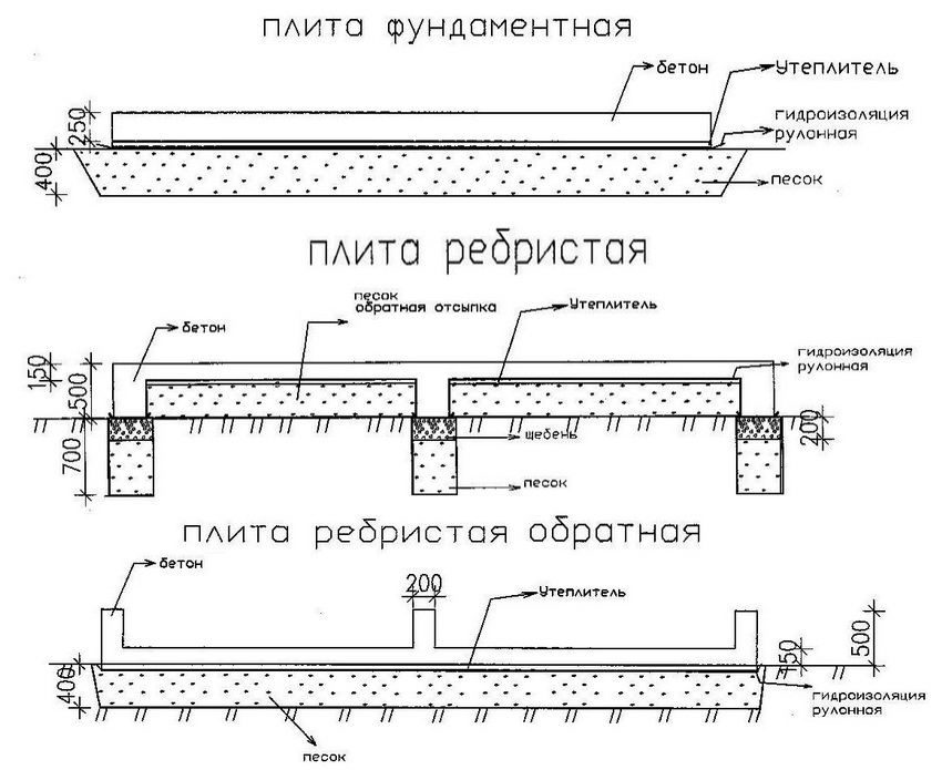 Yayasan Rusia. Ciri khas paparan monolitik konkrit bertetulang di bawah rumah adalah bahawa ia mempunyai tulang rusuk yang kaku. Struktur sedemikian dihasilkan khas untuk tujuan operasi dalam keadaan tidak standard dan keras. Penguat diposisikan sedemikian rupa sehingga berada di bawah dinding yang menanggung beban. Mereka meningkatkan ketahanan papak untuk memikul fros.