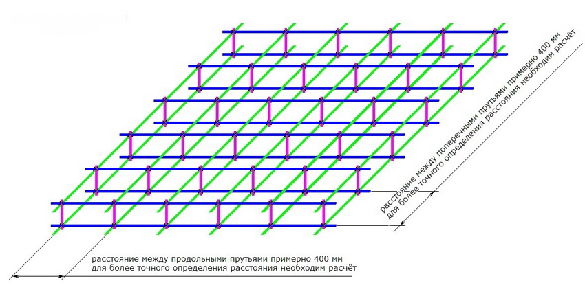 Maklumat berguna! Pada lukisan asas monolitik, rangkaian logam adalah wajib. Jarak piawai antara elemen logam individu dalam reka bentuk ini ialah 20 cm.Penunjuk ini sama-sama sesuai untuk kedua-dua batang membujur dan melintang. Oleh itu, anda dapat dengan cepat mengira bahawa 5 elemen diperlukan untuk panjang 1 m bangunan kediaman.