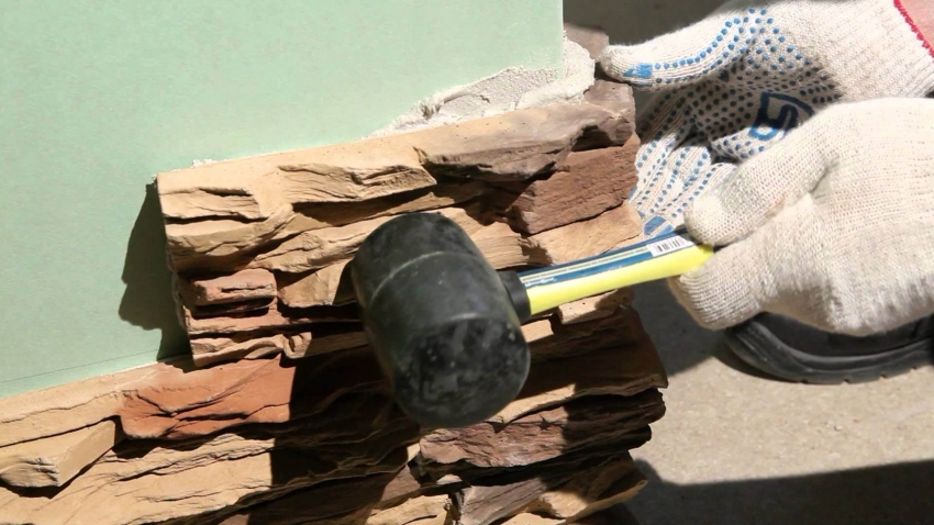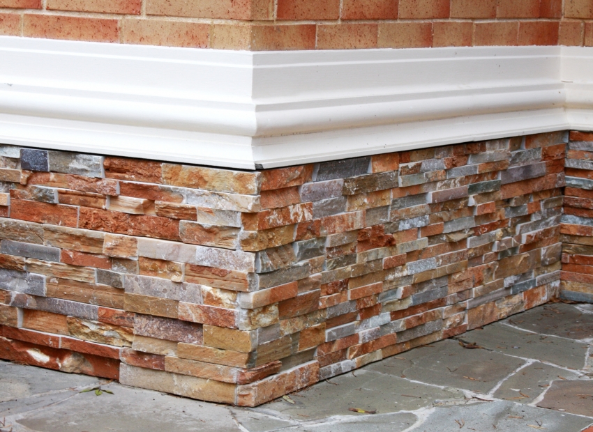Untuk menghias pangkalan dengan batu buatan, anda harus memilih bahan lebih dari tiga warna yang sepadan, yang akan lebih mirip batu semula jadi. Untuk mendapatkan batu yang seragam, elemen besar harus diselingi dengan yang kecil, yang kasar dengan yang halus.