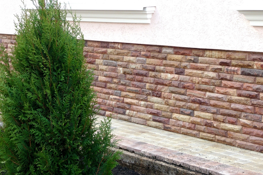 Alternatif untuk bahan semula jadi yang mahal adalah penggunaan batu buatan untuk asasnya. Bahan ini dihasilkan dalam bentuk papak konkrit, lapisan hiasan permukaannya meniru batu semula jadi. Berkat teknologi moden, batu yang tahan lama, boleh dipercayai, tahan fros dan tahan kelembapan untuk ruang bawah tanah diperoleh, yang, dibandingkan dengan batu semula jadi, mempunyai berat badan yang lebih rendah dan harga yang lebih berpatutan.
