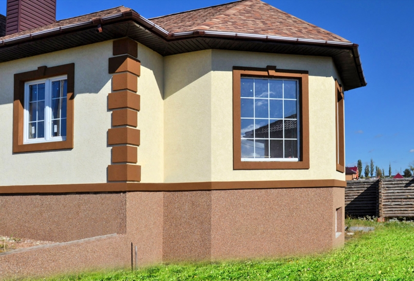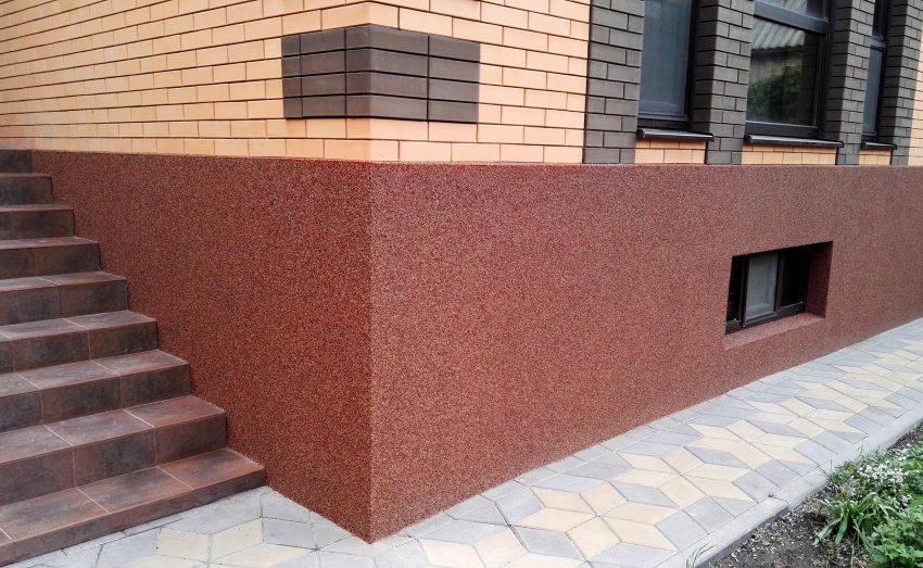 Hiasan plaster bertekstur untuk menghadap ruang bawah tanah, anda boleh mengecat atau membeli komposisi dengan warna yang diperlukan