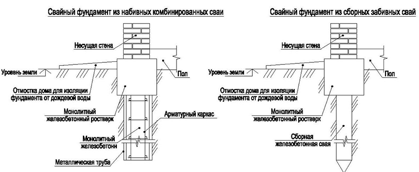 Dengan kaedah rendaman di dalam tanah, landasan cerucuk dapat ditabrak, digerakkan atau dicakar. Pilihan pertama diwakili oleh struktur konkrit atau konkrit bertetulang. Untuk menciptanya, pengukuhan adalah pra-tekanan, yang meningkatkan ketahanan retakan pondasi. Untuk memasang cerucuk di bumi, perlu mengebor bilangan lubang yang diperlukan dengan diameter dan kedalaman tertentu. Paip selongsong logam atau konkrit dimasukkan ke dalam masing-masing. Pengukuhan diturunkan ke dalamnya dan seluruh rongga dipenuhi dengan konkrit.