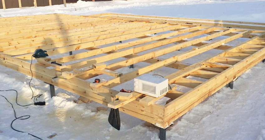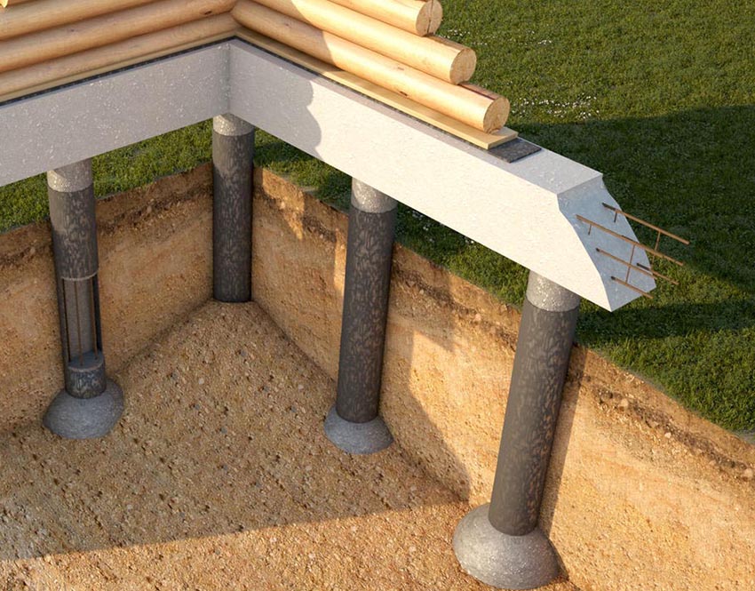 Struktur asas dibuat menggunakan teknologi bingkai, di mana tiang atau tiang diikat bersama untuk membentuk pangkalan yang kukuh. Asas dengan grillage dibina di atas tanah liat, gambut, loess, loamy, heaving dan tanah lumpur. Pembinaan rumah boleh dilakukan di kawasan yang mempunyai hiasan atau di lereng.