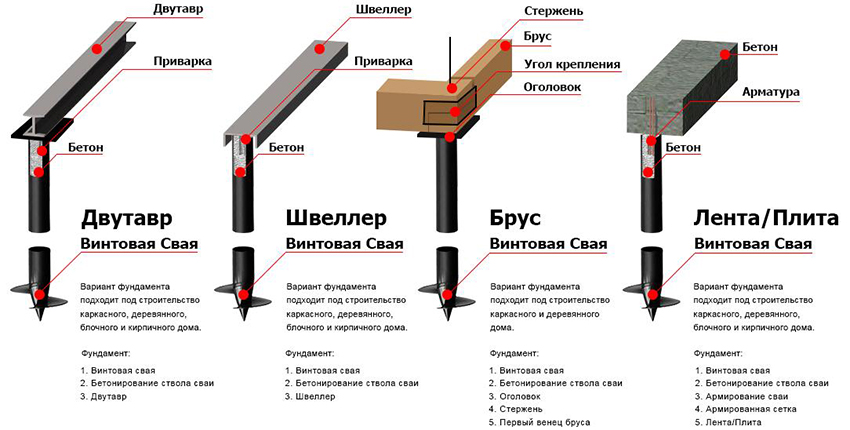 Untuk setiap jenis tanah, jenis cerucuk skru digunakan. Untuk kawasan batu, cerucuk skru pisau sempit digunakan, yang mempunyai petua dan bilah berganda yang dikimpal dengan kuat, yang memberikan lekatan yang boleh dipercayai ke tanah dan mencegah cerucuk dari miring. Untuk tanah yang dicairkan dan disiram, timbunan dengan ujung cor tajam dan pisau bersaiz sederhana digunakan, yang merupakan jaminan mudah penembusan elemen ke dalam tanah tanpa melonggarkannya.