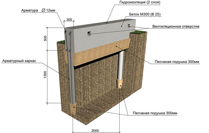 Asas jalur tersembunyi pada timbunan bosan adalah pilihan paling popular, dan pada masa yang sama paling tidak rasional. Untuk menciptanya, parit cetek dipotong sepanjang perimeter bangunan masa depan. Seterusnya, cerucuk dipasang sedemikian rupa sehingga kepalanya melekat keluar dari bahagian bawah parit. Bantal pasir mengendap. Selepas itu, selokan-selokan dilakukan, bahagian bawahnya terletak di bawah permukaan tanah. Seterusnya, grillage konkrit dibuat.
