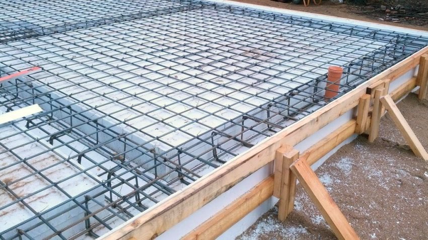 Ketebalan batang dipilih dengan mengambil kira struktur, salji dan beban operasi di permukaan. Utiliti tidak boleh dipasang di stiffeners. Agar tidak merosakkan penebat, disarankan untuk memasang sangkar tetulang spasial secara berasingan, dan kemudian anda perlu meletakkannya siap pada penjepit khas di daerah di mana grillage berada, di mana bingkai saling terhubung. Pengikatan mesh papak dilakukan di lokasi. Struktur bawah dipasang pada klip PVC.