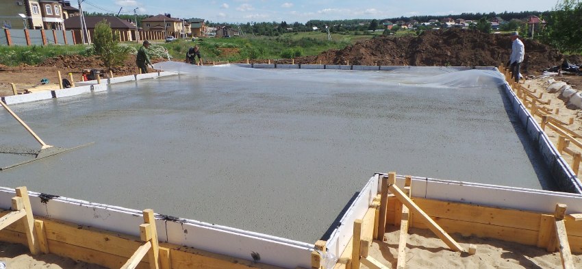 Plat bahan penebat hendaklah diletakkan di seluruh permukaan pondasi. Tidak digalakkan untuk mengikatnya dengan pelekat tambahan. Untuk membuat lapisan padat yang seragam, konkrit mesti dituangkan sekali gus. Oleh itu, penting di sini untuk mengira jumlah bahan yang diperlukan untuk mengisi formwork dengan betul.