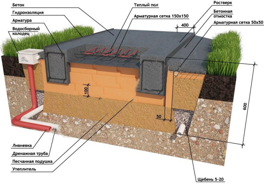 - untuk kawasan sejuk, di mana, berkat asas tersebut, kehilangan haba dari rumah dikurangkan;