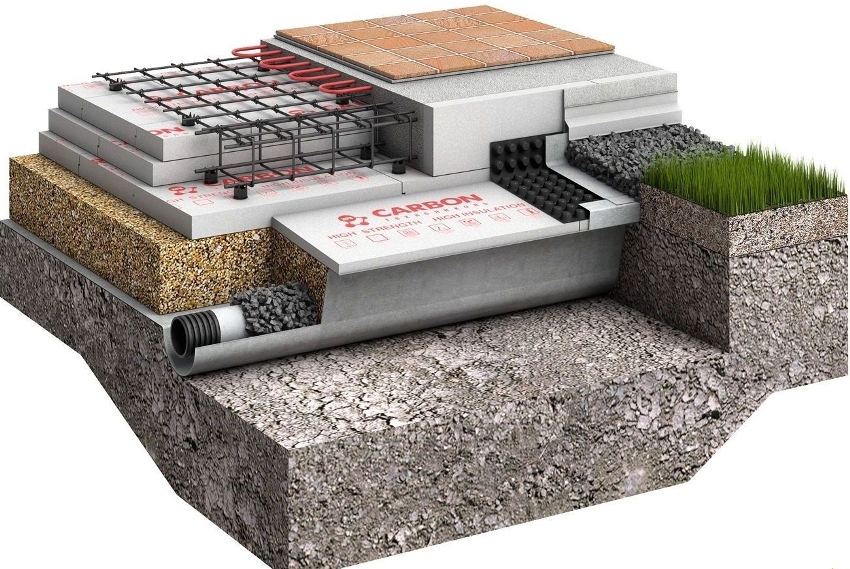 - terima kasih kepada lapisan penebat tambahan, kemungkinan pembekuan tanah di bawah dasar pondasi dikecualikan, yang akan menyelamatkan papak dari kenaikan dan penyusutan pangkalan;