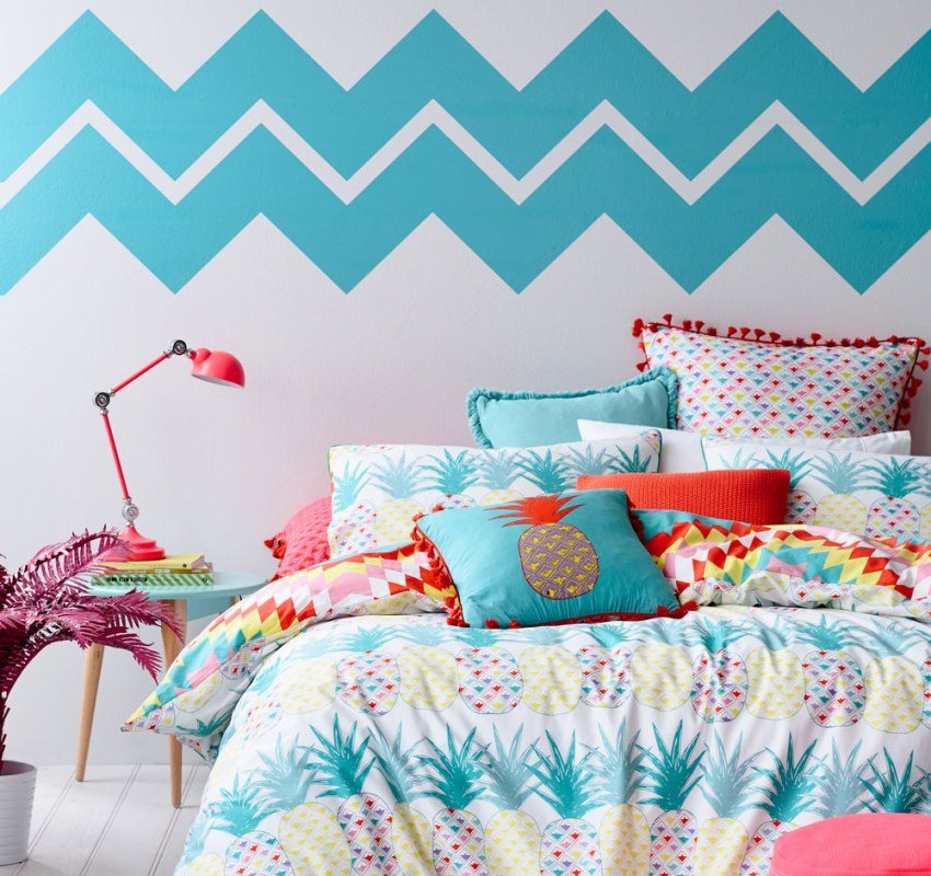 Gabungan warna warna arah panas dan sejuk boleh diterima, tetapi ia mesti ditangani dengan sangat berhati-hati. Terutama jika mereka berada di kawasan terpencil palet.Kain ini merangkumi merah dan biru, ungu dan hijau muda. Mereka bertentangan antara satu sama lain dan akan menimbulkan ketidaksesuaian pada reka bentuk bilik tidur.