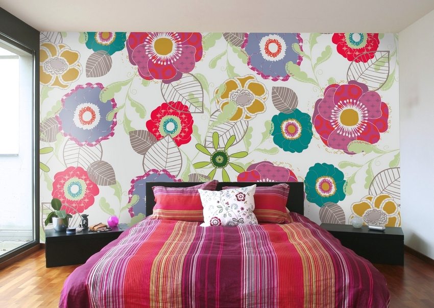 Dalam beberapa keadaan, pelekat mungkin merupakan penyelesaian yang ideal. kertas dinding gambar, dihiasi dengan corak bersaiz besar. Kemasan dengan jenis bahan ini dapat digunakan untuk menonjolkan kawasan tertentu di dalam bilik. Foto-foto dalaman bilik tidur dengan kertas dinding, yang sering menarik perhatian di majalah fesyen dan di Internet, dengan jelas mengesahkan betapa berkesannya reka bentuk sedemikian.