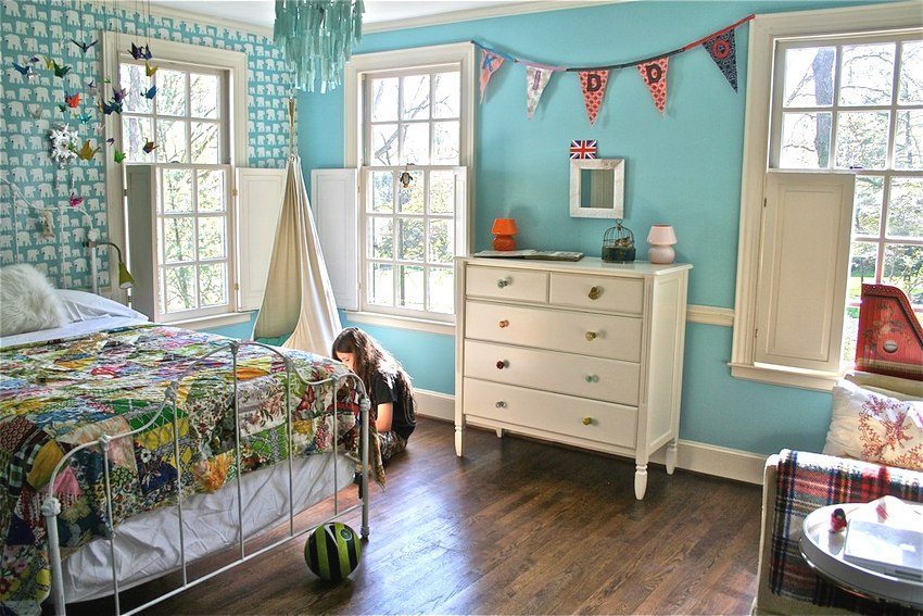 Ciri-ciri pilihan warna dan foto bahagian dalam bilik tidur 15 kaki persegi.
