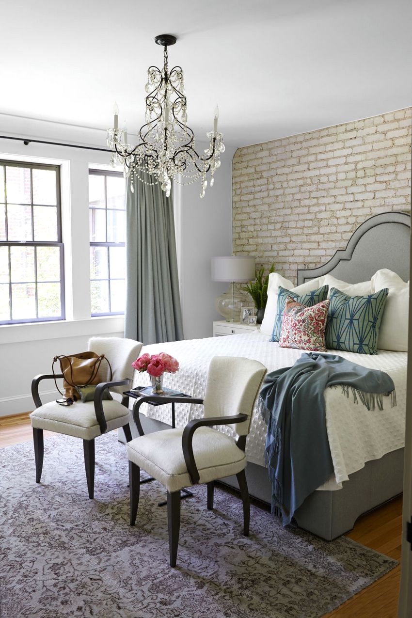 Foto bahagian dalam bilik tidur dengan gaya Provence dan kehalusan penggunaan hiasan