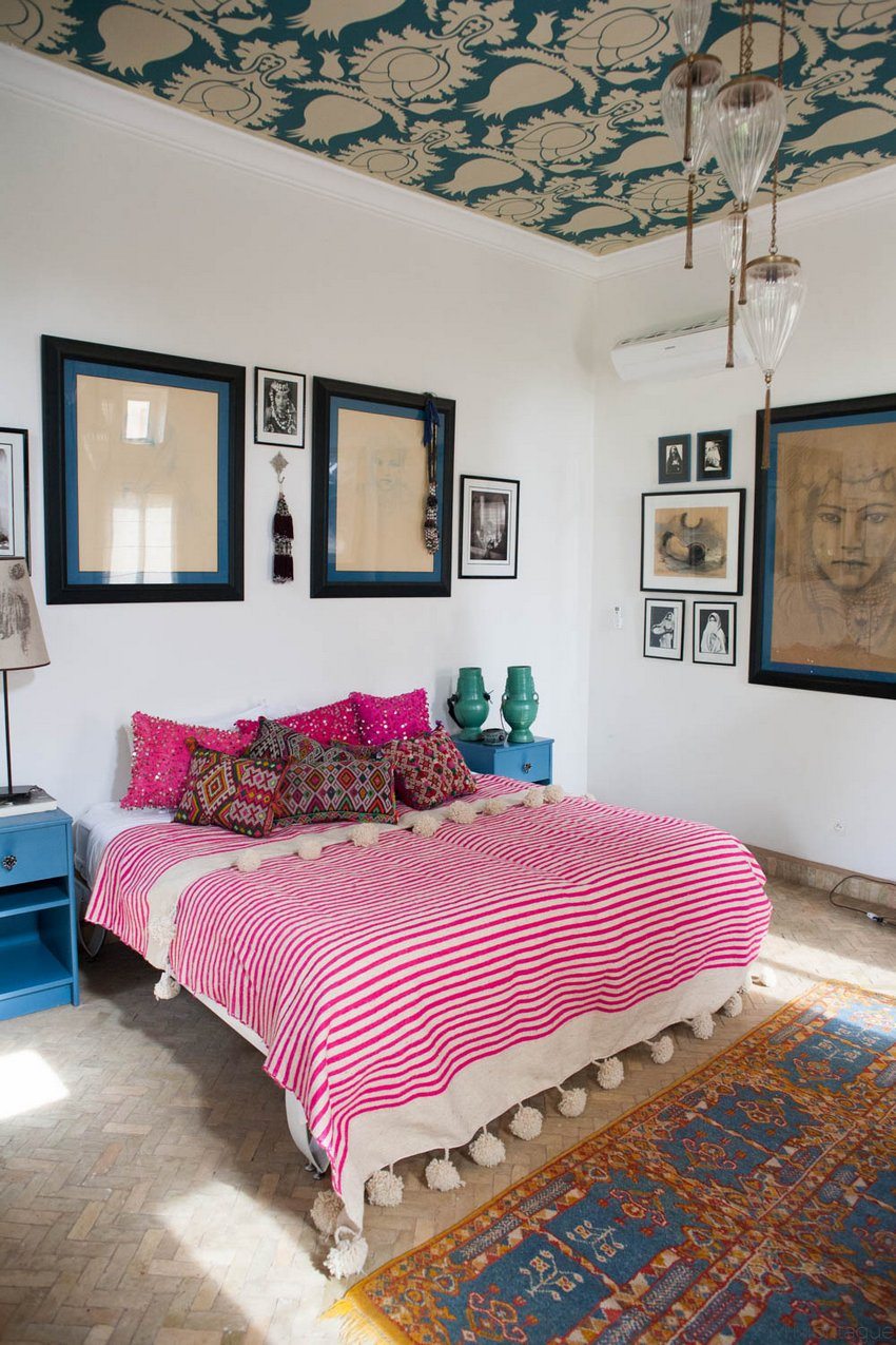 Contoh reka bentuk siling yang spektakuler menggunakan kertas dinding terang dan kombinasinya dengan dinding polos