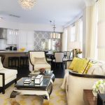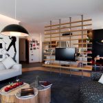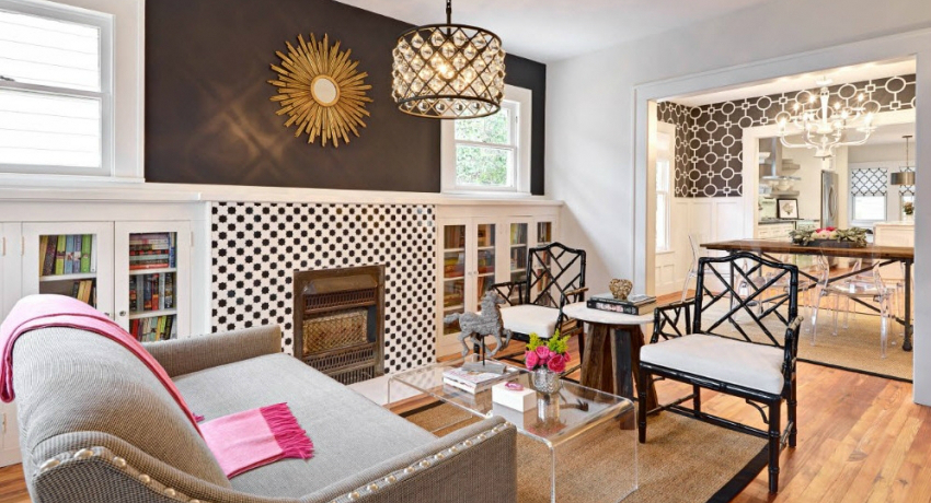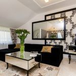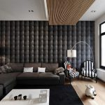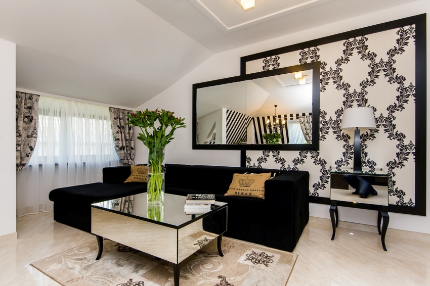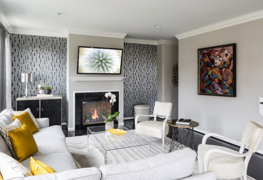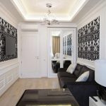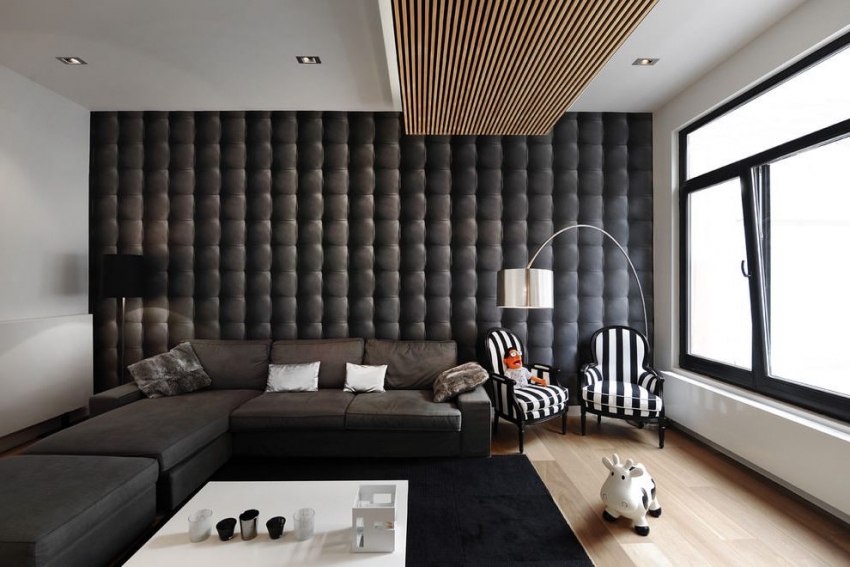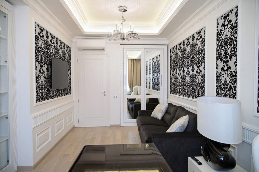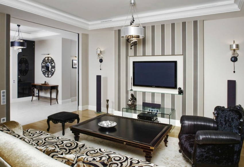 Sekiranya ruang tamu berada di sebelah cerah, kombinasi kertas dinding hitam dan putih boleh digunakan untuk menghiasnya.