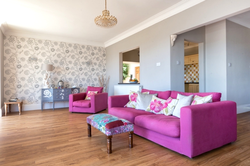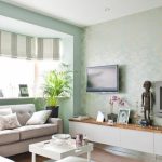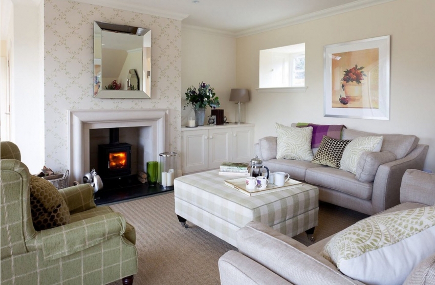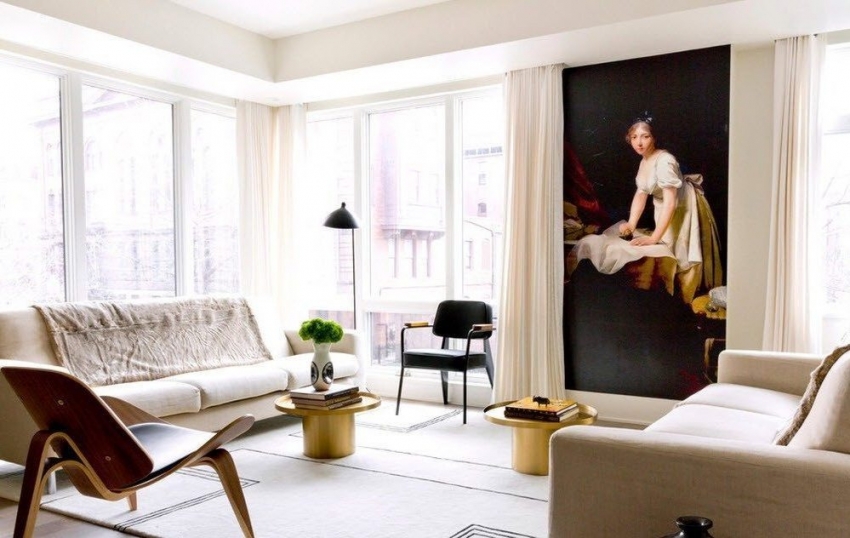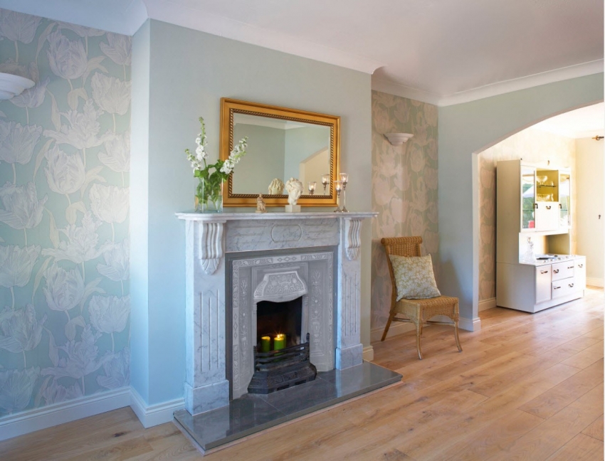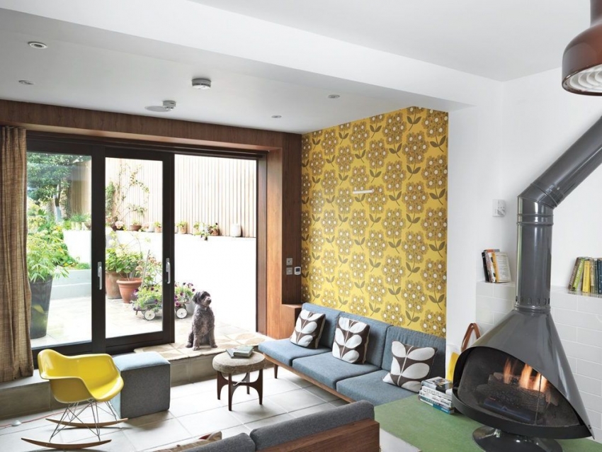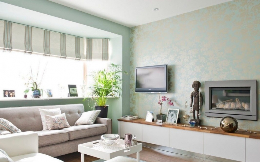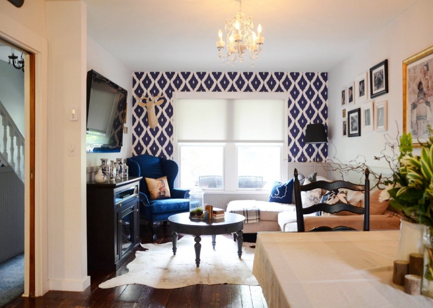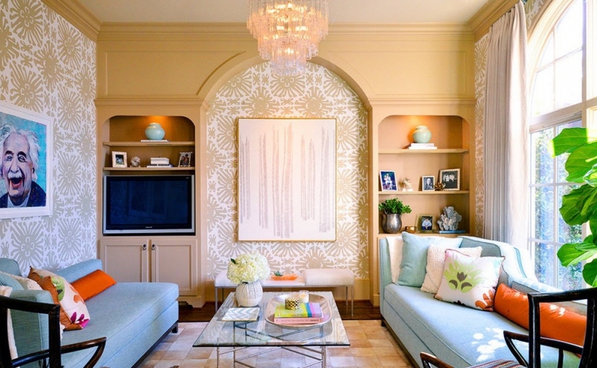Sekiranya ruang tamu terletak di sebelah utara rumah, lebih baik menggunakan kertas dinding dengan warna terang dan hangat.