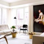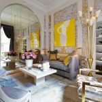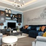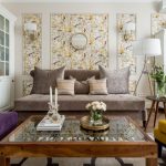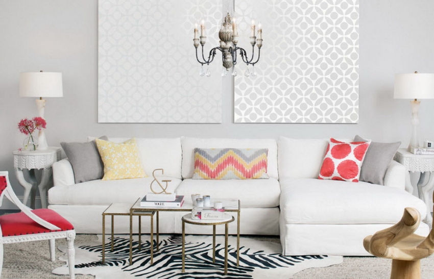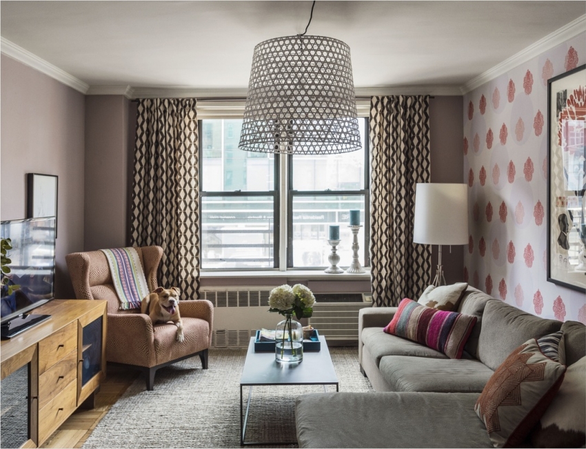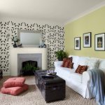 Kaedah gabungan hiasan kertas dinding di ruang tamu: idea foto dengan kanvas bercorak