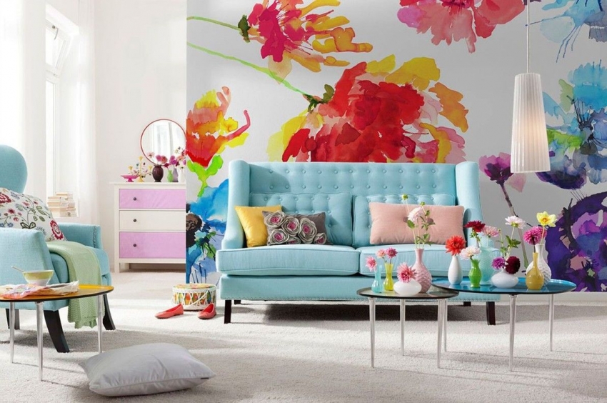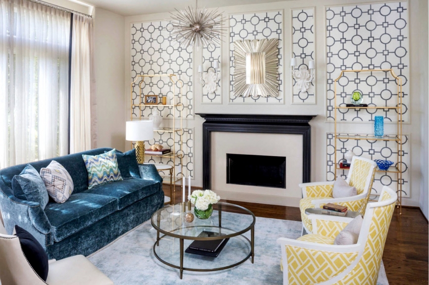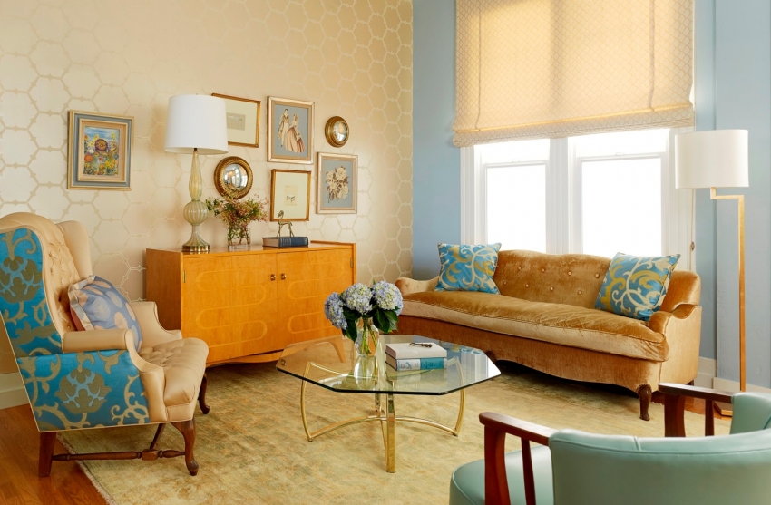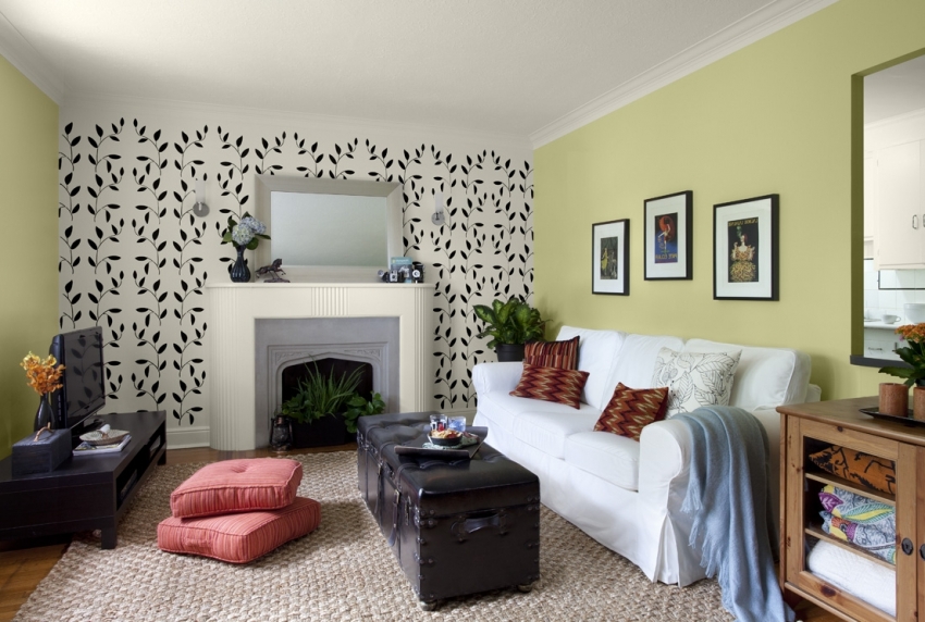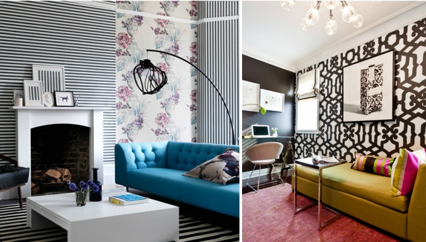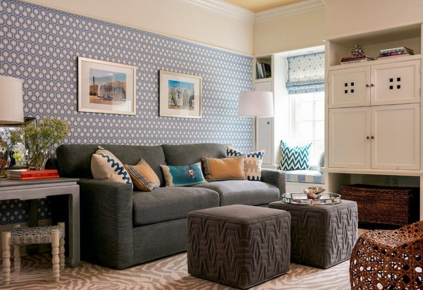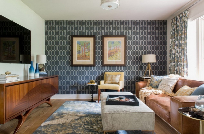 Kertas dinding untuk ruang tamu: gambar dalaman dengan reka bentuk yang menarik