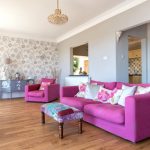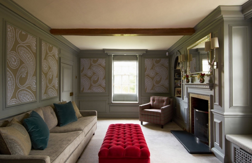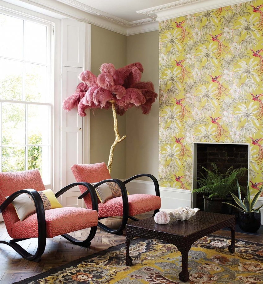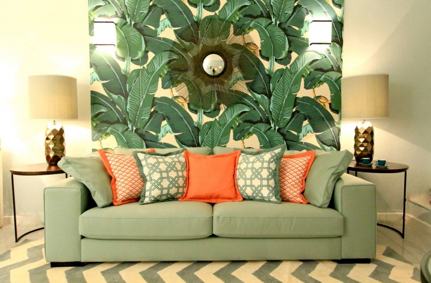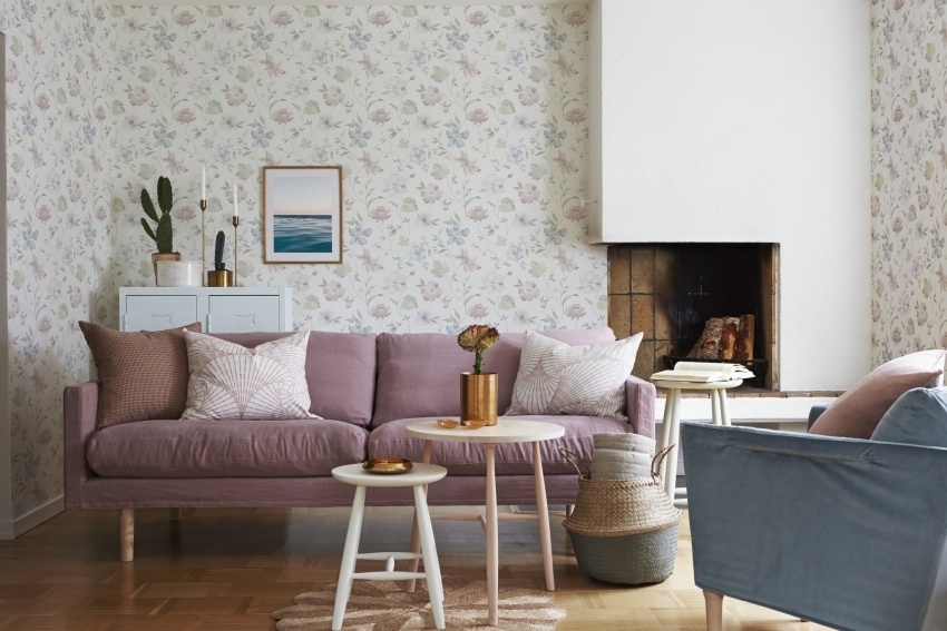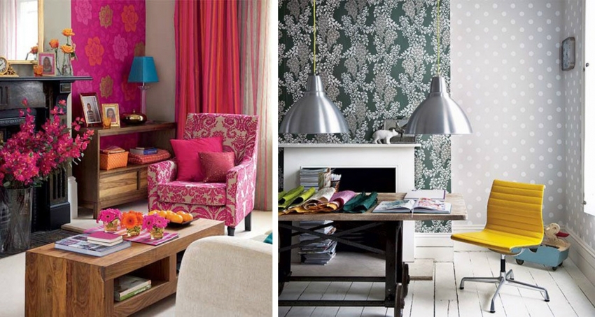 Kertas dinding dengan cetakan bunga atau haiwan menunjukkan penggunaan perincian dalaman dan tekstil dengan corak yang serupa