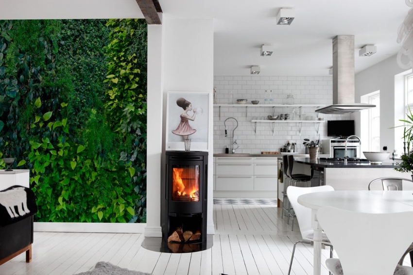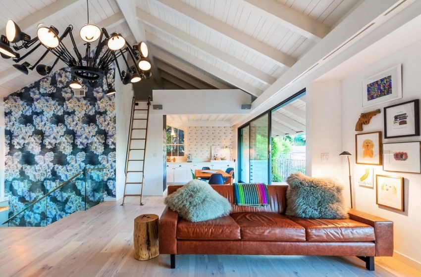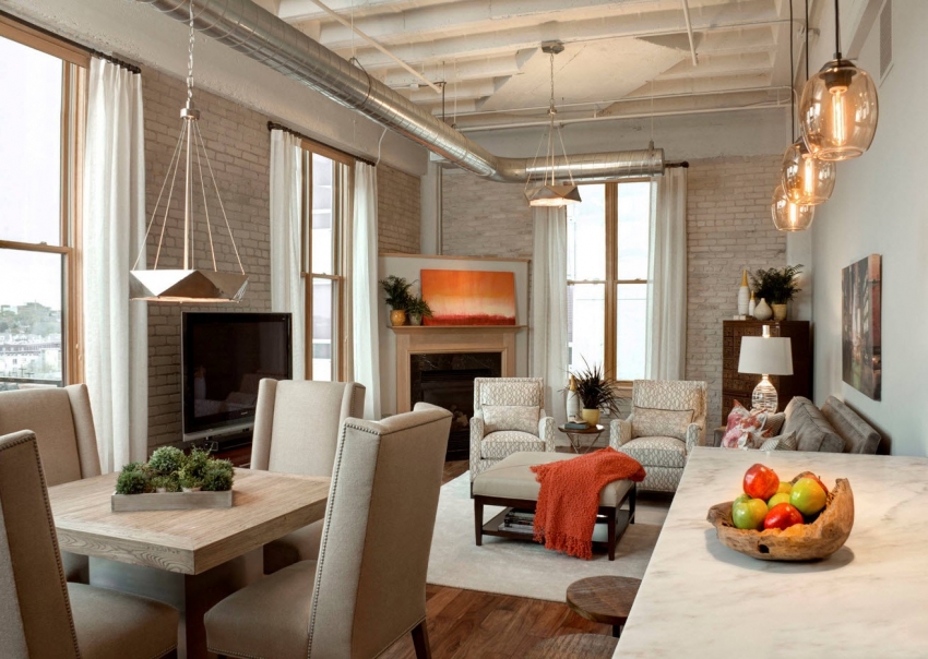 Gabungan kertas dinding putih dan batu bata tiruan sering digunakan untuk hiasan dalaman dalam gaya loteng dan moden