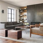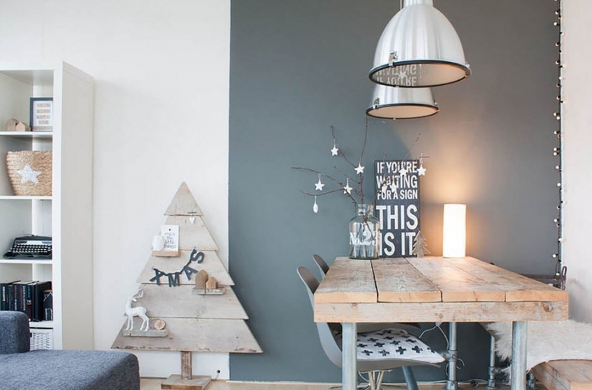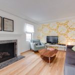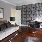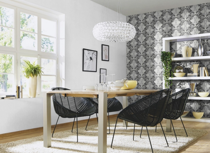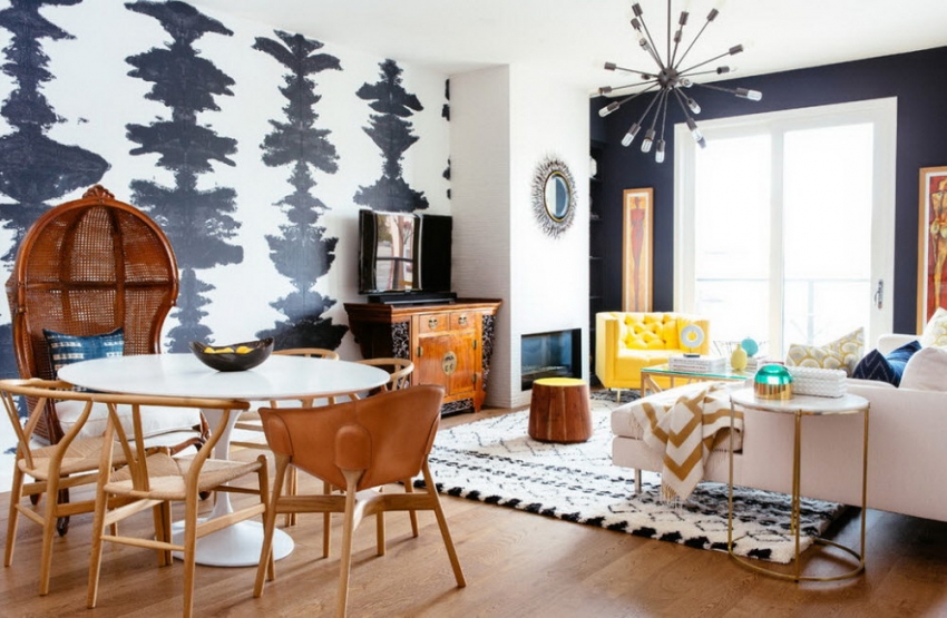 Hitam dan putih kertas dinding digabungkan dengan indah dengan perabot kayu semula jadi
