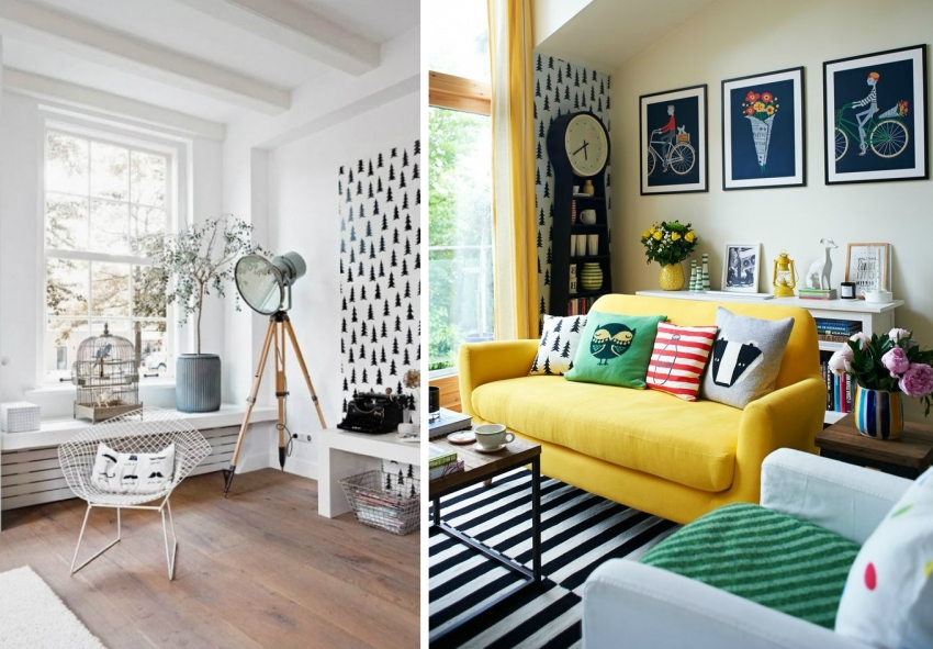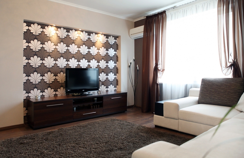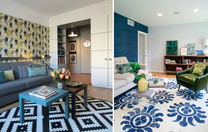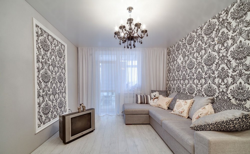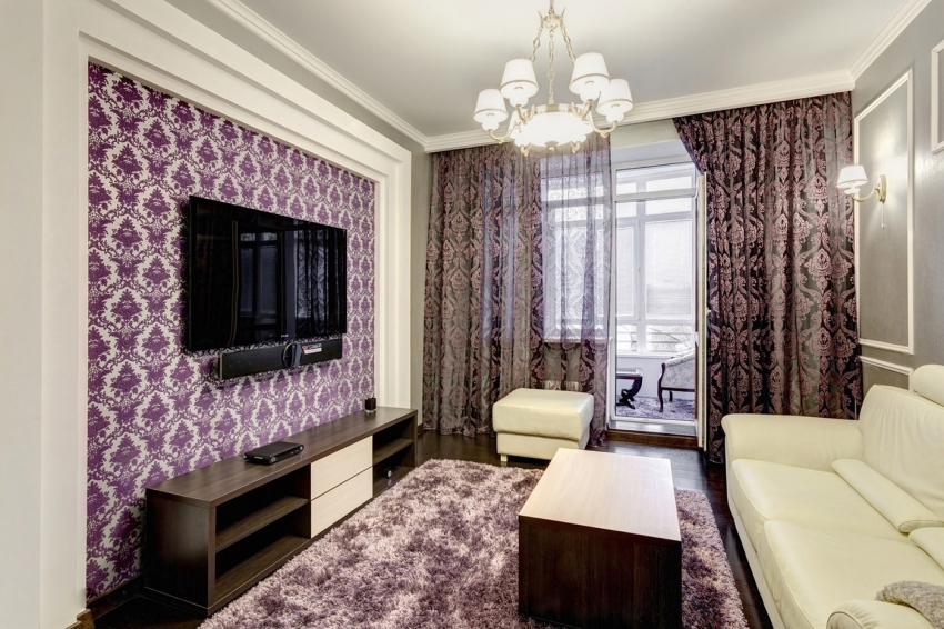 Menggabungkan kertas dinding membolehkan anda menonjolkan kawasan ruang tamu yang bermanfaat dan menyembunyikan kekurangan dalam susun atur