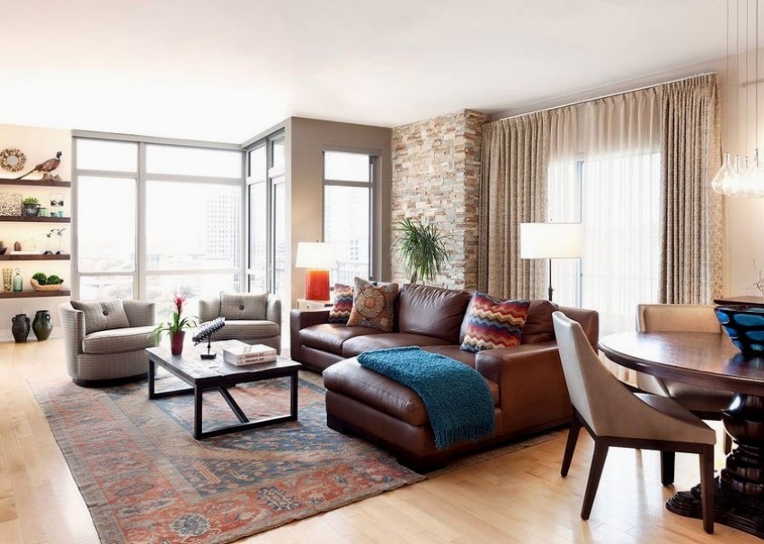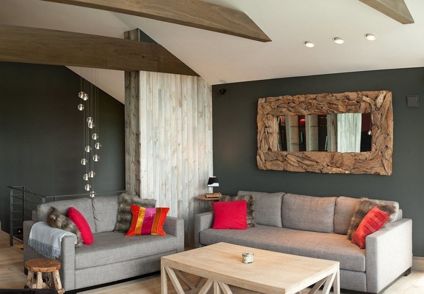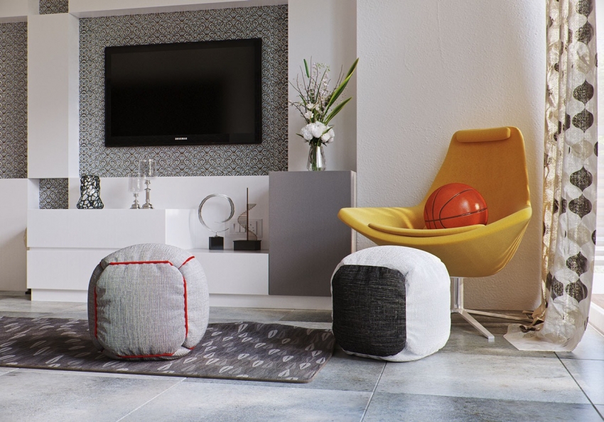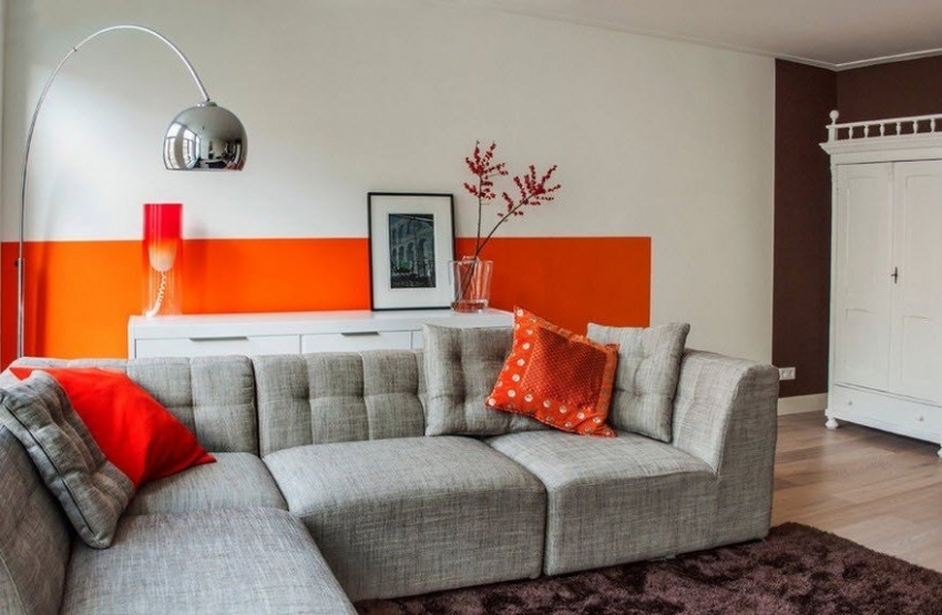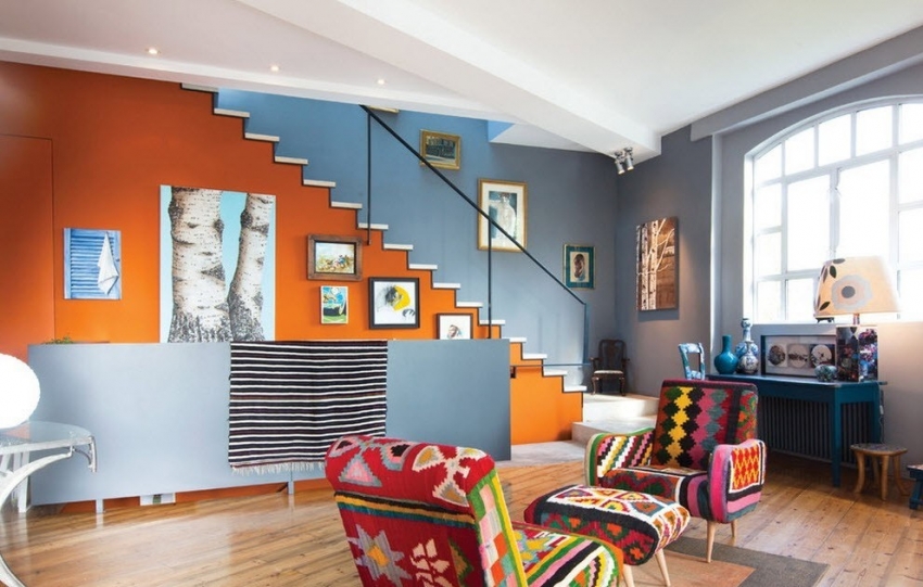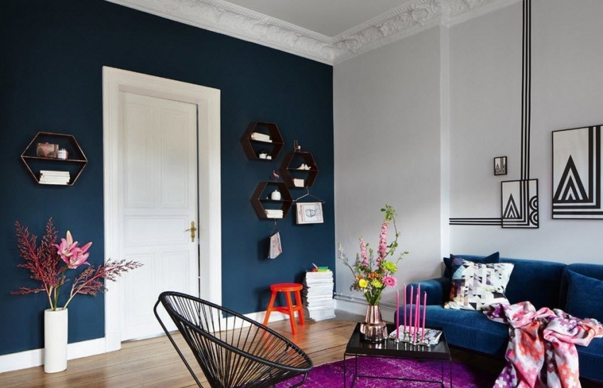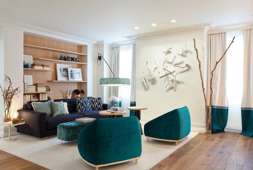 Nota! Tidak digalakkan menggunakan lebih daripada 2-3 bahan dengan warna neutral atau aktif. Warna kaya digunakan untuk membuat bahagian dalaman yang dinamik. Untuk suasana yang santai, pilih warna terang.