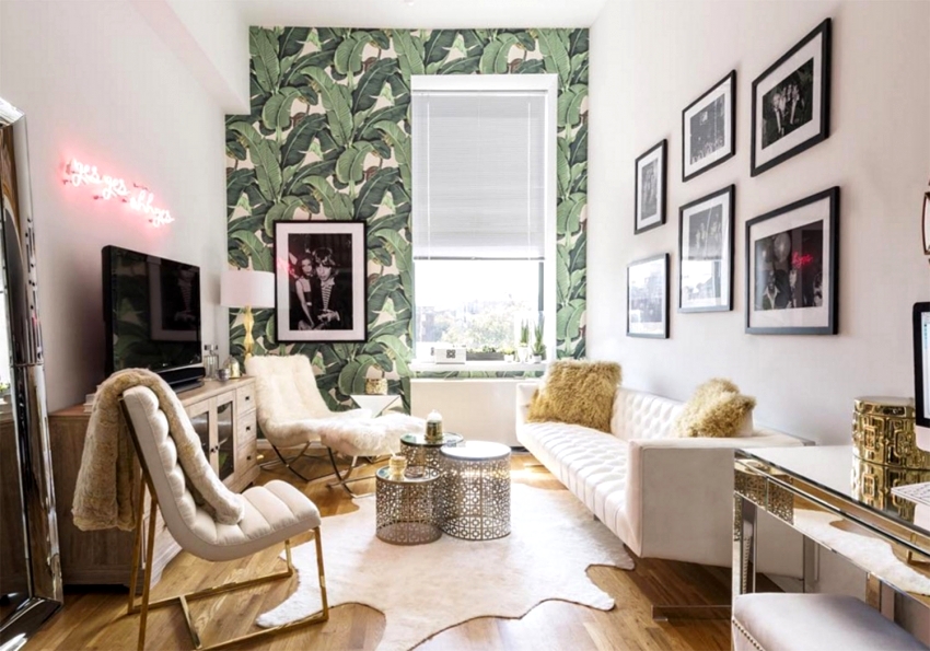 Semasa menghias ruang tamu, anda boleh menggunakan beberapa jenis kertas dinding dengan komponen hiasan yang berbeza.