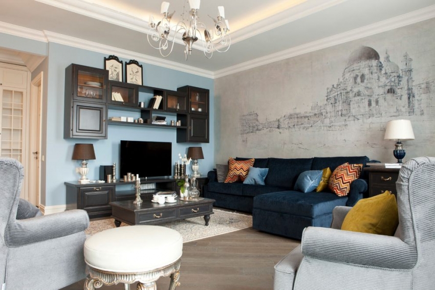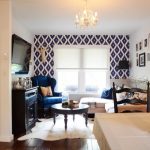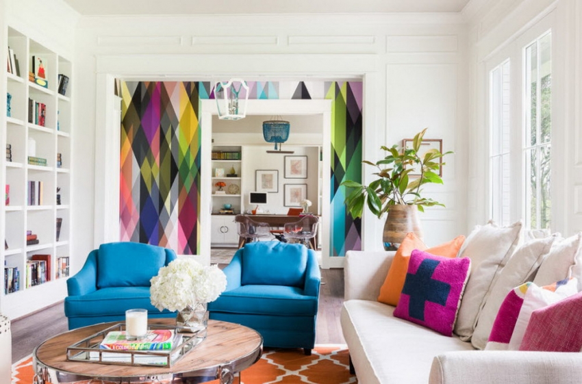 Menghiasi dinding aksen dengan kertas dinding dalam warna yang berbeza adalah salah satu cara moden dan popular untuk menghiasi ruang tamu.