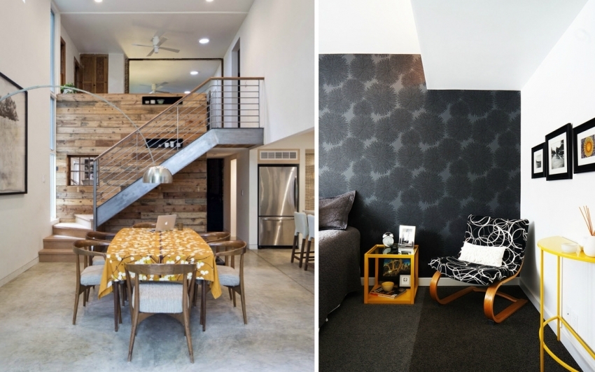 Sekiranya terdapat pilihan antara gabungan dan jenis kertas dinding yang sama, maka pereka dalam kebanyakan kes menekankan pilihan pertama. Bahagian dalaman, dibuat berdasarkan bahan yang berbeza dari segi tekstur, warna atau corak hiasan, kelihatan menarik secara estetik.