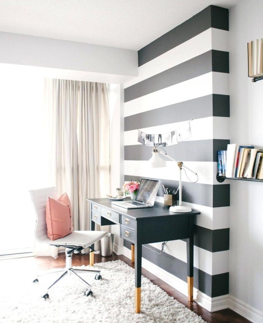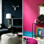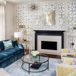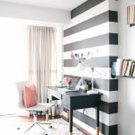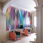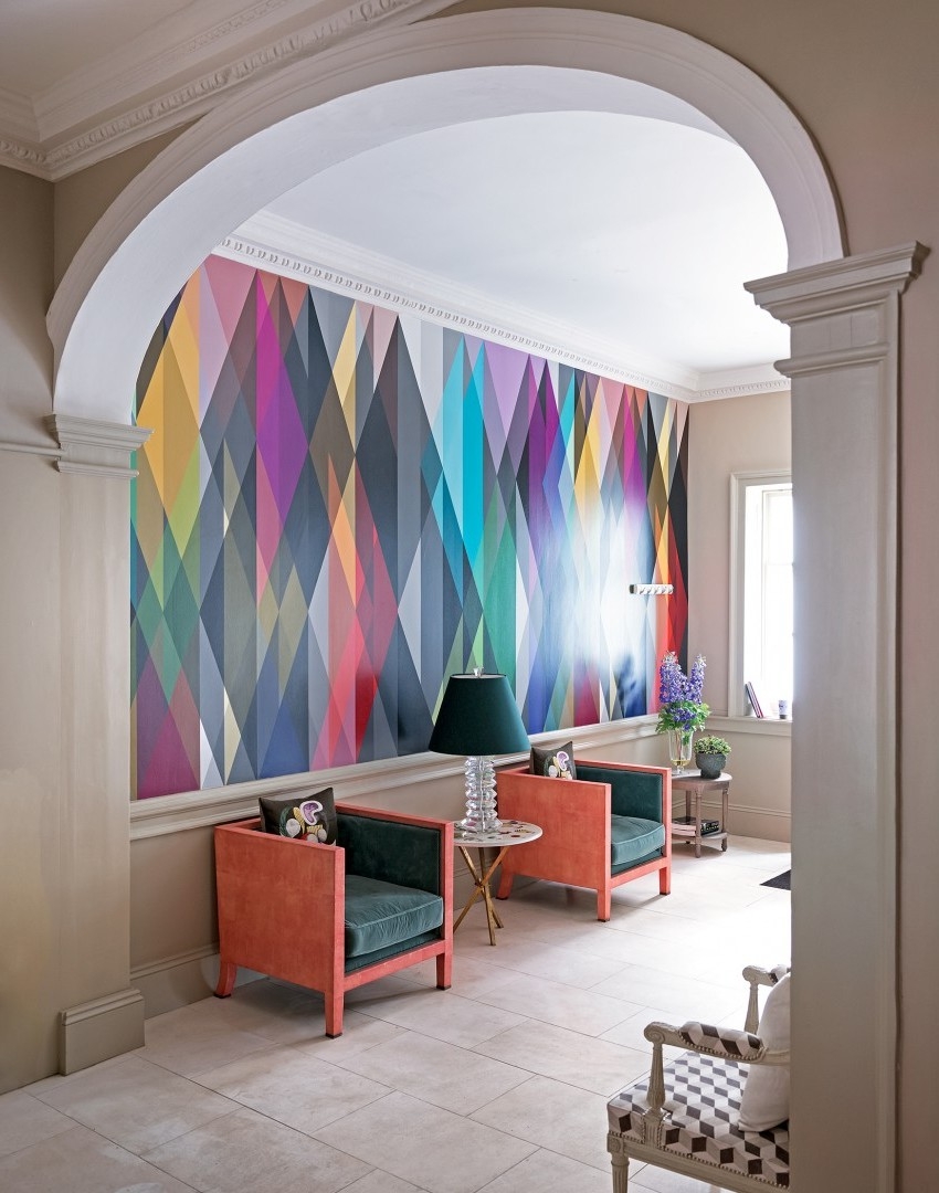 Penggunaan kertas dinding kontras dengan corak geometri dapat memanjangkan atau mengembangkan dinding aksen secara visual